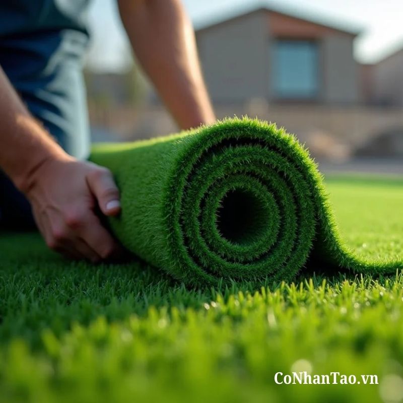 Hoàn thiện: Dùng chổi cứng chải ngược chiều sợi cỏ để cỏ đứng thẳng, tự nhiên và êm ái hơn.