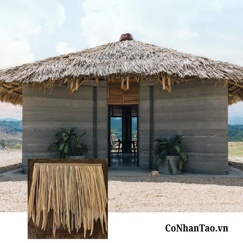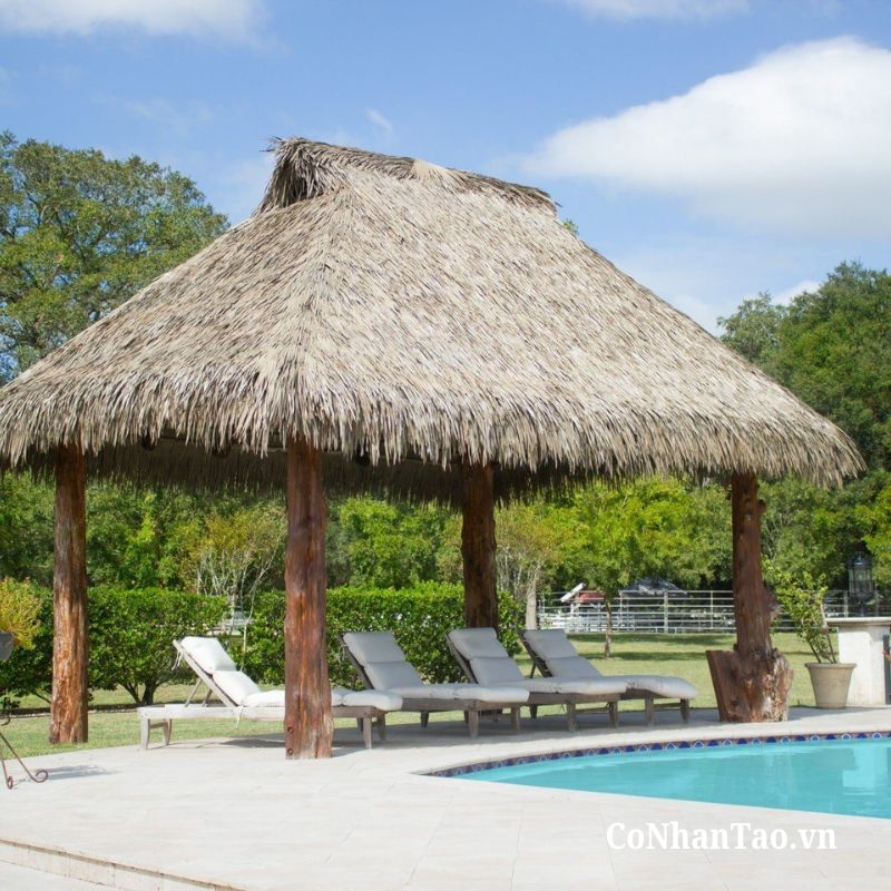 Mái lá nhân tạo giúp công trình giữ được vẻ mộc mạc nhưng vẫn đảm bảo độ bền và sự đồng đều về màu sắc.